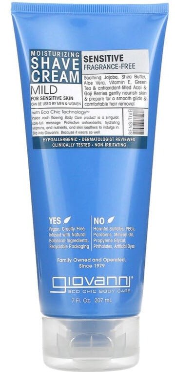 Inside each flowing Body Care product is a singular, care-full message: Protective antioxidants, hydrating vitamins and nutrients, and skin soothers to indulge in. Slip into Giovanni. Because it wears so well.Moisturize, soothe and prepare skin for the best shave with Giovanni's exclusive fragrance-free blend of soothing extracts. This gentle cream hydrates, protects and nourishes even the most sensitive skin to help prevent irritation, ingrown hairs, nicks, cuts, razor bumps and rashes for a close shave without the discomfort or pain. Ready, set, effectively glide. Finally, a shave you can look forward to and skin left completely smooth and touchable. Yes: Vegan, Cruelty-Free, Infused with Natural Botanical Ingredients; No: Harmful Sulfates, PEGs, Parabens, Mineral Oil, Propylene Glycol, Phthalates, Artificial Dyes