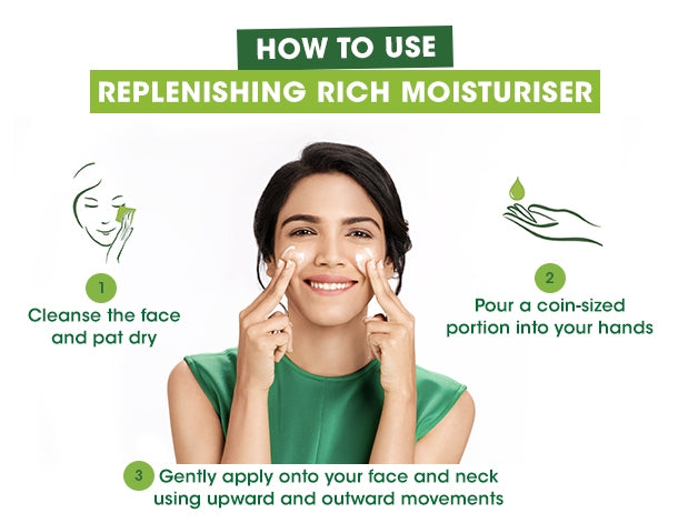 - Apply a small amount of the Replenishing Rich Moisturiser to your fingertips.